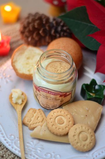 Manjar blanco tradicional decembrino en camita de buñuelo y espolvoreado con galletas de navidad. La magia deliciosa de la navidad en un frasco.