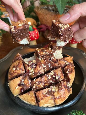 Pan bañadoen fondue de chocolate para comer caliente y dar pellizcos de alegría. Combinado deliciosamente con trocitos de maní y arándanos.
