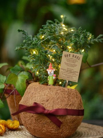Pino azul joven sembrado en kokedama de coco natural (15 a 25 cm aprox), con lucecitas de navidad y Dael navideño: gnomito que llega a multiplicar la magia de la naturaleza a tu hogar y cuidar el jardín.